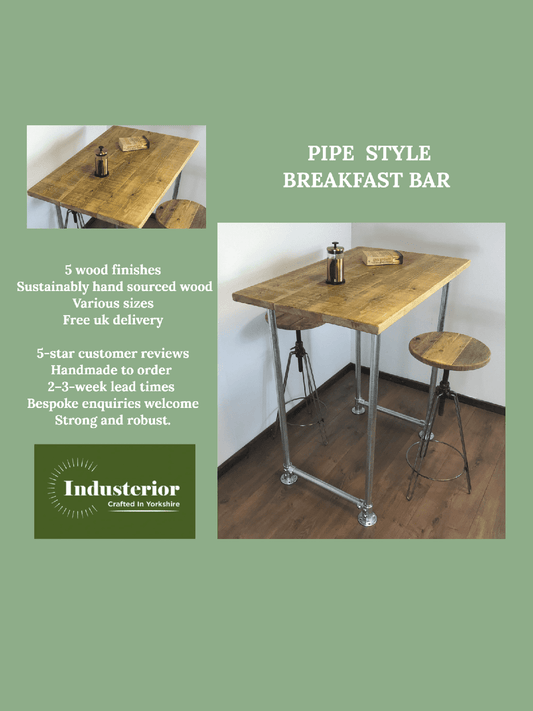 Industrial Rustic Breakfast Bar Free standing - Black pipe style legs - adjustable feet - sustainable wood - hand made in Yorkshire.