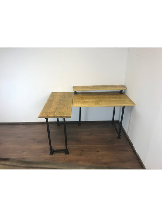 Rustic Corner Desk, with sturdy scaffold style black pipe legs, 5 wood finishes -Right/left-handed-Customisable. Industrial l shaped desk.