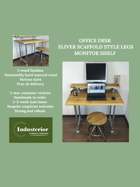 Rustic Industrial Pipe Office Desk with 5 choices of wood finish, Including monitor shelfScaffold style office desk using sustainable timber.