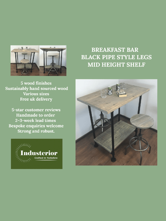 Industrial Breakfast Bar and shelf with Black Pipe Legs, adjustable feet for uneven floors- rustic sustainable wood.